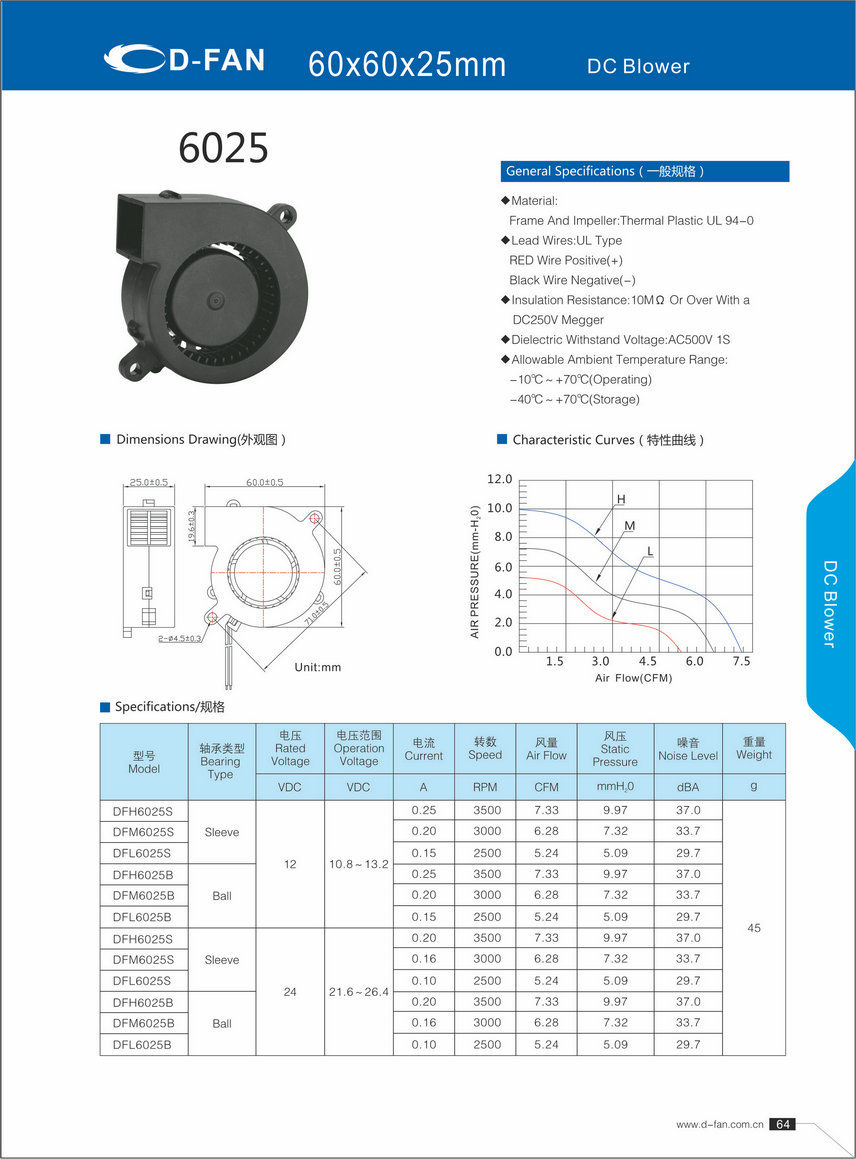 材料: 框架和叶轮:热塑UL 94-0 引线:UL型 红线正极(+) 黑线负极(-) 绝缘电阻:10MΩ或以上,带DC250V高阻表 介质耐压:AC500V 1S 允许环境温度范围: -10℃~+70℃(运行) -40℃~+70℃(储存)
